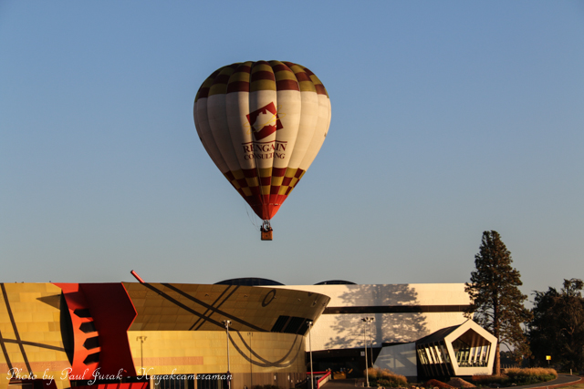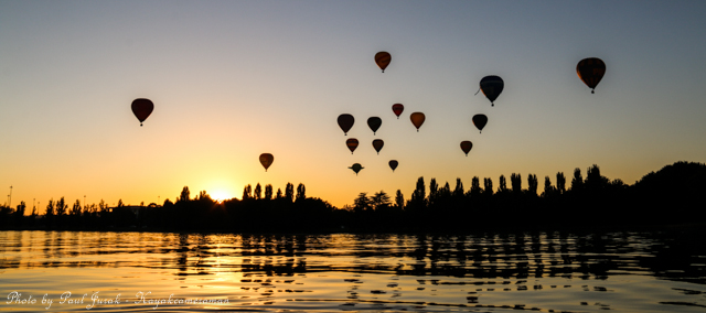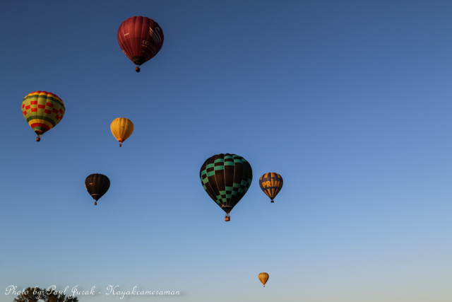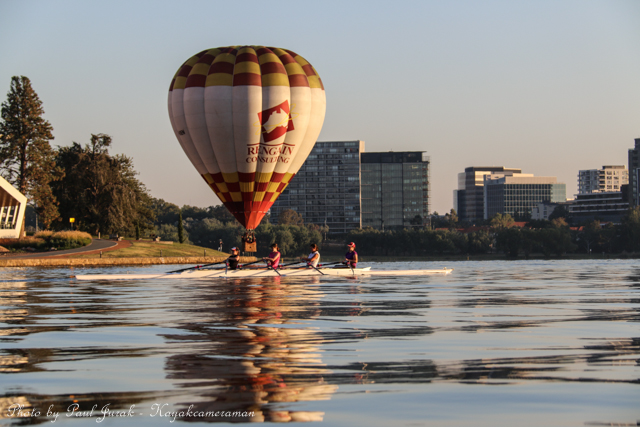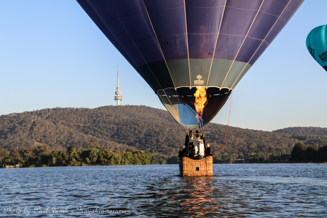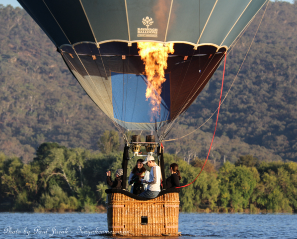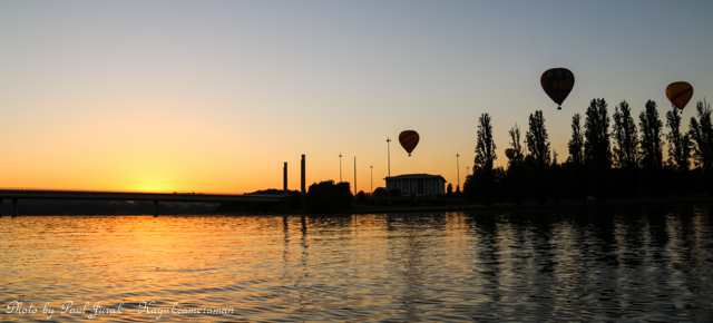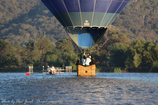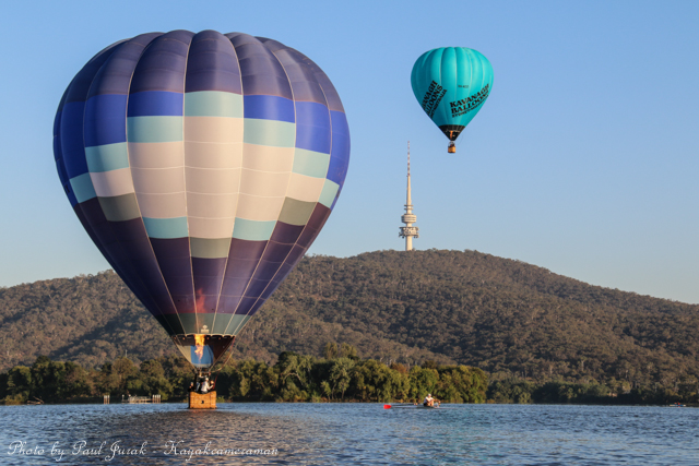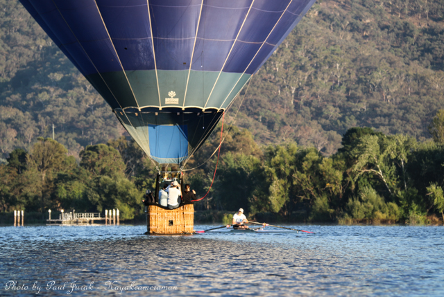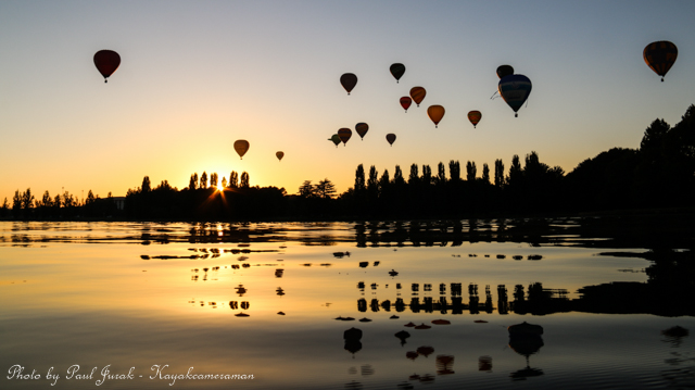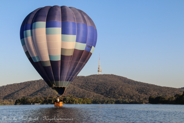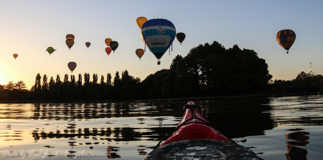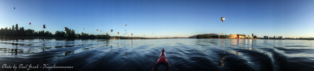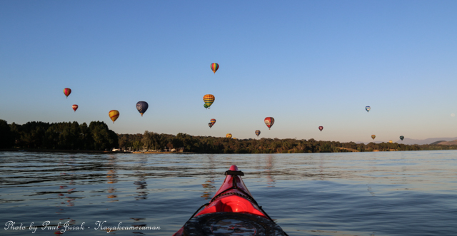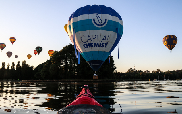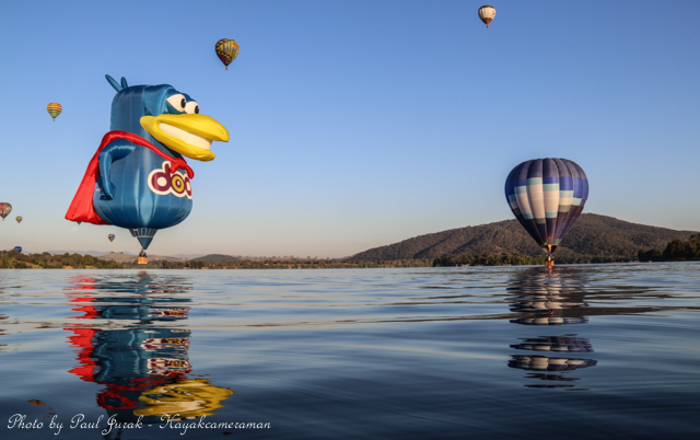 7 March 2015: The sky was peppered with a colourful spectrum of hot balloons this morning signalling the beginning of the Canberra Balloon Spectacular. The event took off in spectacular style with fun new flying faces including a giant Dodo bird, Yoda and an Angry Bird balloon. It was great to see the balloon enthusiastic coming back to Canberra to support this wonderful event. I had balloons drifting millimetres from the nose of the Red Chilli (my kayak) and even managed to have my own chaperone as I was towed by a passing balloon across the water’s surface. The spectacular is running until March 15 so do yourself a favour and catch this national event.